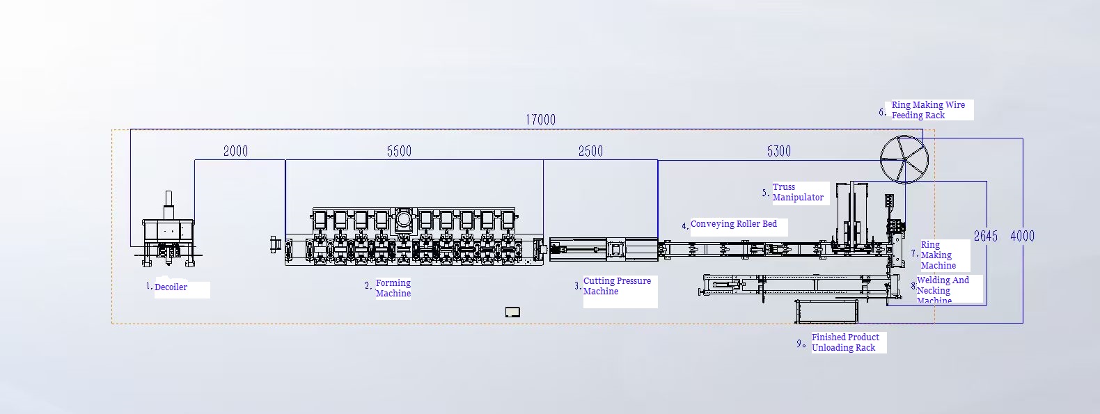 The production line consists of: 3-ton hydraulic decoiler → anchor bolt forming machine → counter, necking and cutting unit → feeder → gantry truss robot arm → ring assembling workbench → ring making machine → ring welding machine → main control cabinet → hydraulic components → finished product collecting hopper.